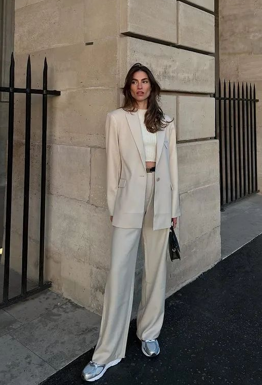 西装成套穿时很容易造成商务职业感,这时可以借助万能的配饰!墨镜、耳饰、丝巾……都是增添造型精致感的buff。