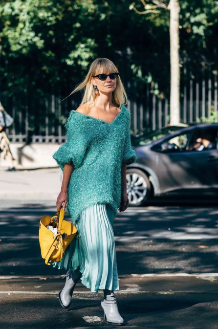 穿着这类毛衣的时候,越随性越有范,下身搭配阔腿裤,营造一种自在的氛围,整体更显干净轻盈。