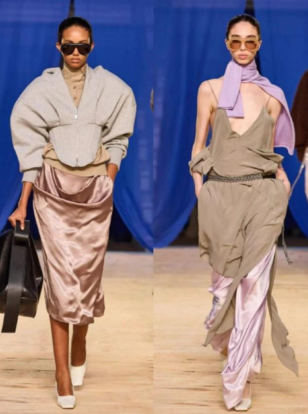 将缎面的光泽感与柔和色调相融,搭配简约廓形与细节设计,呈现出兼具优雅与现代感的秋冬穿搭美学,适合通勤、约会、轻社交等多元场景。