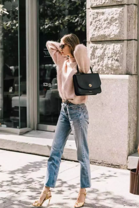牛仔材质的烟管裤实用性更大,许多场合都可以穿,和毛衣的随性舒适风格不谋而合。