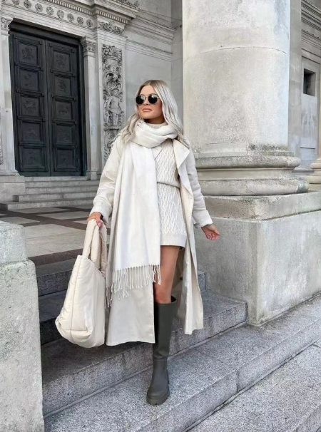 搭配外套时可优先选直筒西装、简约风衣,全程敞开穿,露出荡领与高领的叠穿层次,弱化正装拘谨感,更显利落;