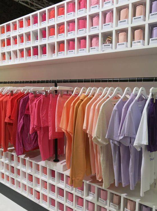 侧挂也是每个店铺中都会用到的陈列方法,也属于IP范畴,是供顾客拿取的。由于侧挂时的量比较多,且看不到衣服的整面,所以在陈列时一定要注意色彩的组合和变化,还要高低错落,以求静中有“动”,使陈列有一种节奏感。